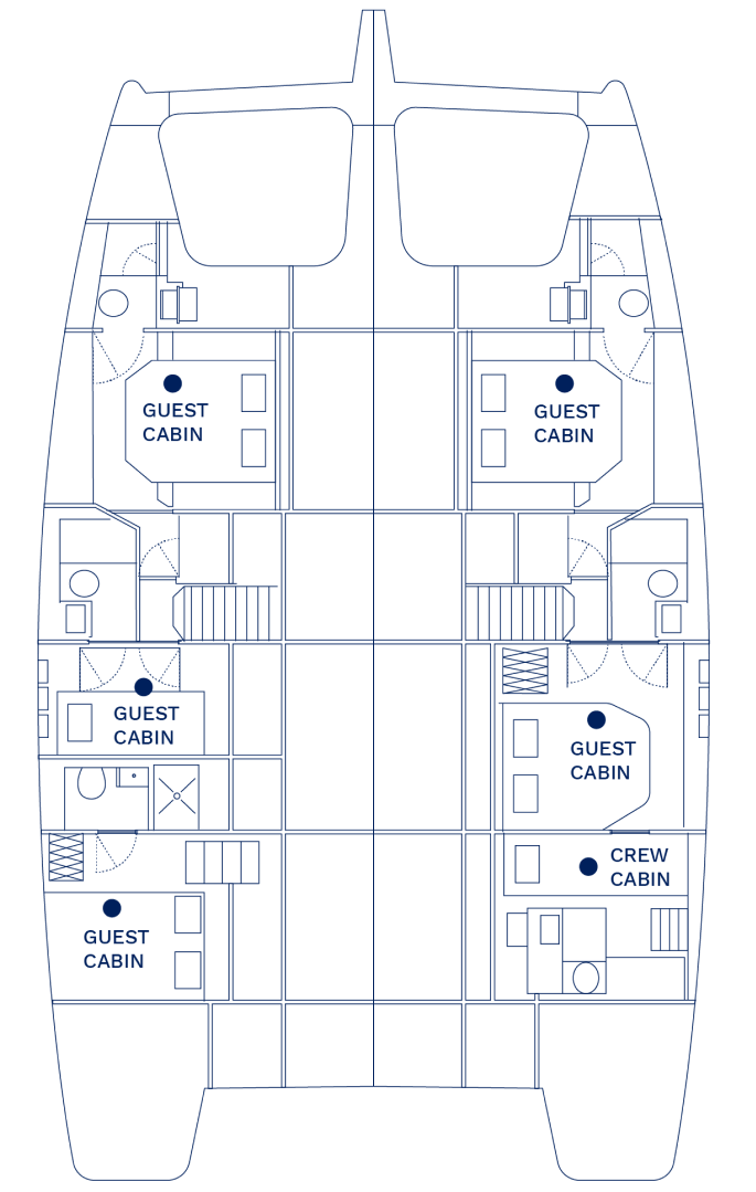 With a thoughtfully designed layout, ADARA features four spacious cabins, accommodating up to eight guests. Each cabin provides stunning morning views through multiple portholes, creating a seamless connection to the beauty of the sea.