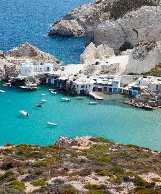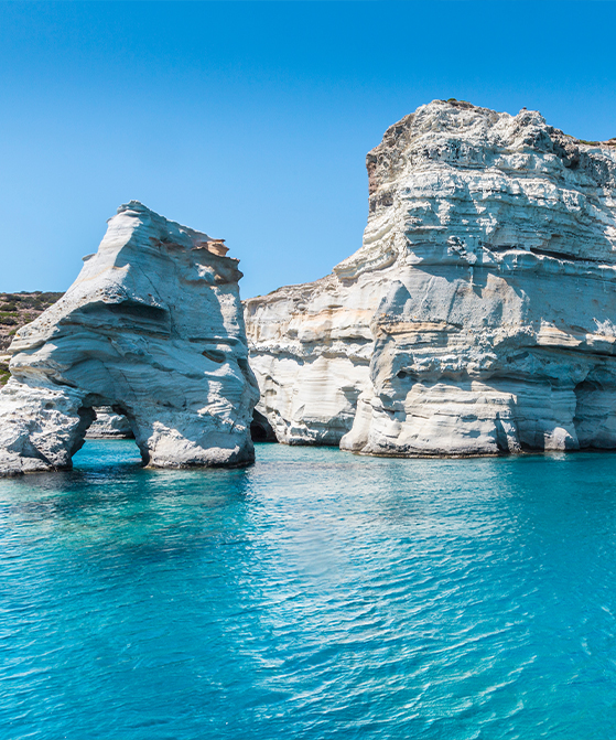 Milos, celebrated for its enchanting beaches, boasts a rich tapestry of myths and traditions, earning it the moniker “island of pirates.” A standout destination is Kleftiko, once a genuine pirate hideout, now captivating visitors with its striking white volcanic formations, crystal-clear waters, and hidden caves. Equally mesmerizing is Sarakiniko, where white volcanic rocks plunge into the sea, crafting a surreal, lunar-like landscape. Exploring its concealed coves and caves offers a glimpse into the island’s intriguing past.