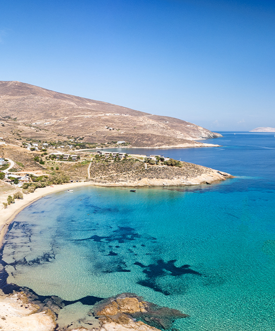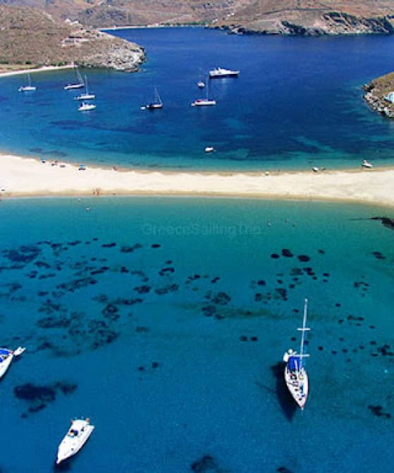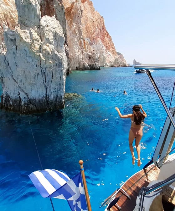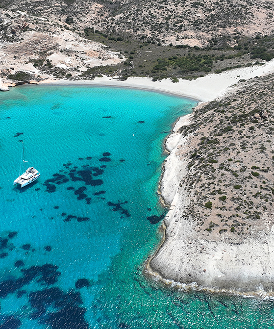Between Kimolos and Milos lies Polyaigos, the oasis of the Cyclades. Approaching the island, one is immediately struck by its imposing white cliffs rising majestically from the sea. Among its hidden treasures is one of the most beautiful beaches in the Cyclades, Galazia Nera. This secluded spot boasts white sands and crystal-clear, turquoise waters, making it a paradise for snorkeling enthusiasts eager to explore its captivating underwater world.