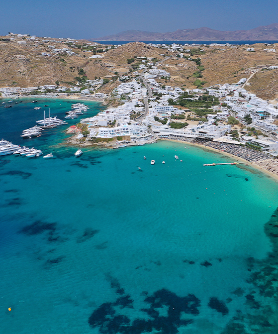 Mykonos, known as the “Island of the Winds,” is the most popular island of the Cyclades. It is an island that will enchant you at first sight. One of the most beautiful destinations worth visiting is Platis Gialos. Located on the southern side of the island, it is characterized by a family-friendly atmosphere. The beach features an expansive golden sandy shore and offers well-equipped facilities, attracting lovers of water sports and leisure.
